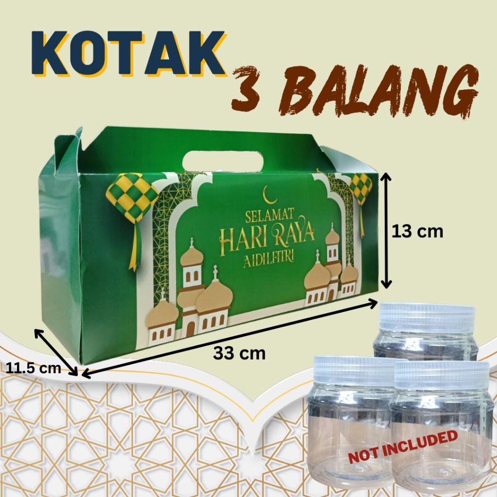 Size Kotak 3 Balang : 33cm (lebar tapak) x 11.5cm (lebar) x 13cm (tinggi)